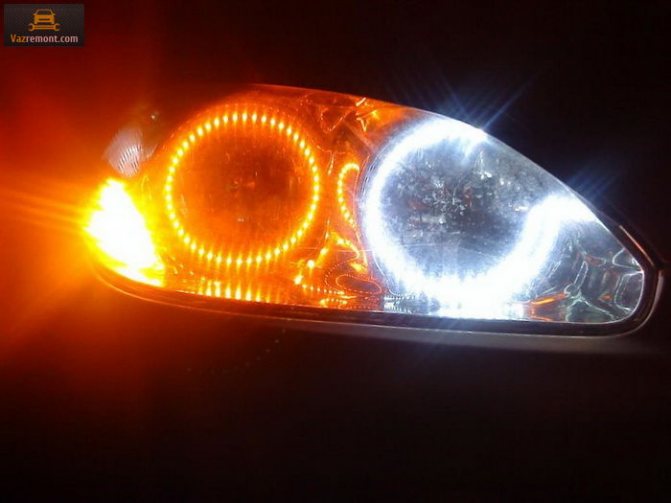 - Светодиоды. Их установка еще более проблематична, но зато появляется эффект «ангельские глазки». Для этого помимо диодов потребуются прозрачные трубки.