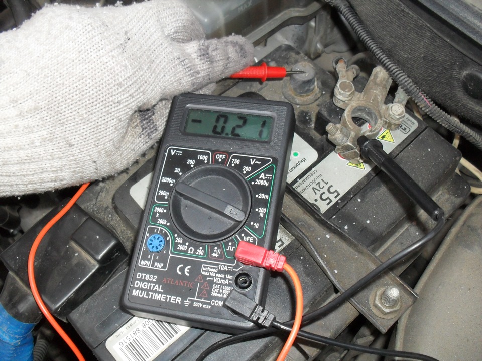 Для проверки в разрыве плюсового участка нужно: настроить мультиметр. Отключить плюсовую клемму. Минус устройства присоединить к плюсу АКБ, плюс мультиметра соединить с минусом аккумулятора. Если все действия были выполнены правильно, прибор покажет количество потребления.