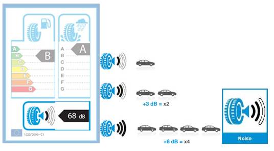 Классификация ЕС измеряет уровень наружного шума в децибелах, который создается шинами. Также маркировка имеет и графическое отображение уровня шумности покрышек: одна, две и три черных волны. Чем больше волн — тем более шумная покрышка.