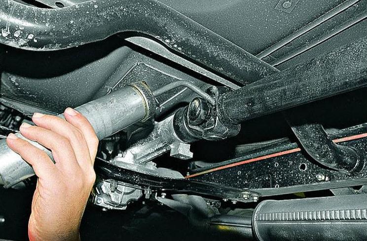 Для выполнения работ по шприцеванию крестовины карданного вала потребуется загнать автомобиль на эстакаду и установить под колеса противооткатные упоры. Далее выполните следующие действия: