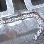 Далее начинается сам процесс сварки. Для этого блок цилиндров нужно разогреть до 650 градусов по Цельсию, после чего с помощью присадочного чугунно-медного прута и флюса накладывается сплошной шов. Далее деталь постепенно охлаждается в термошкафу.